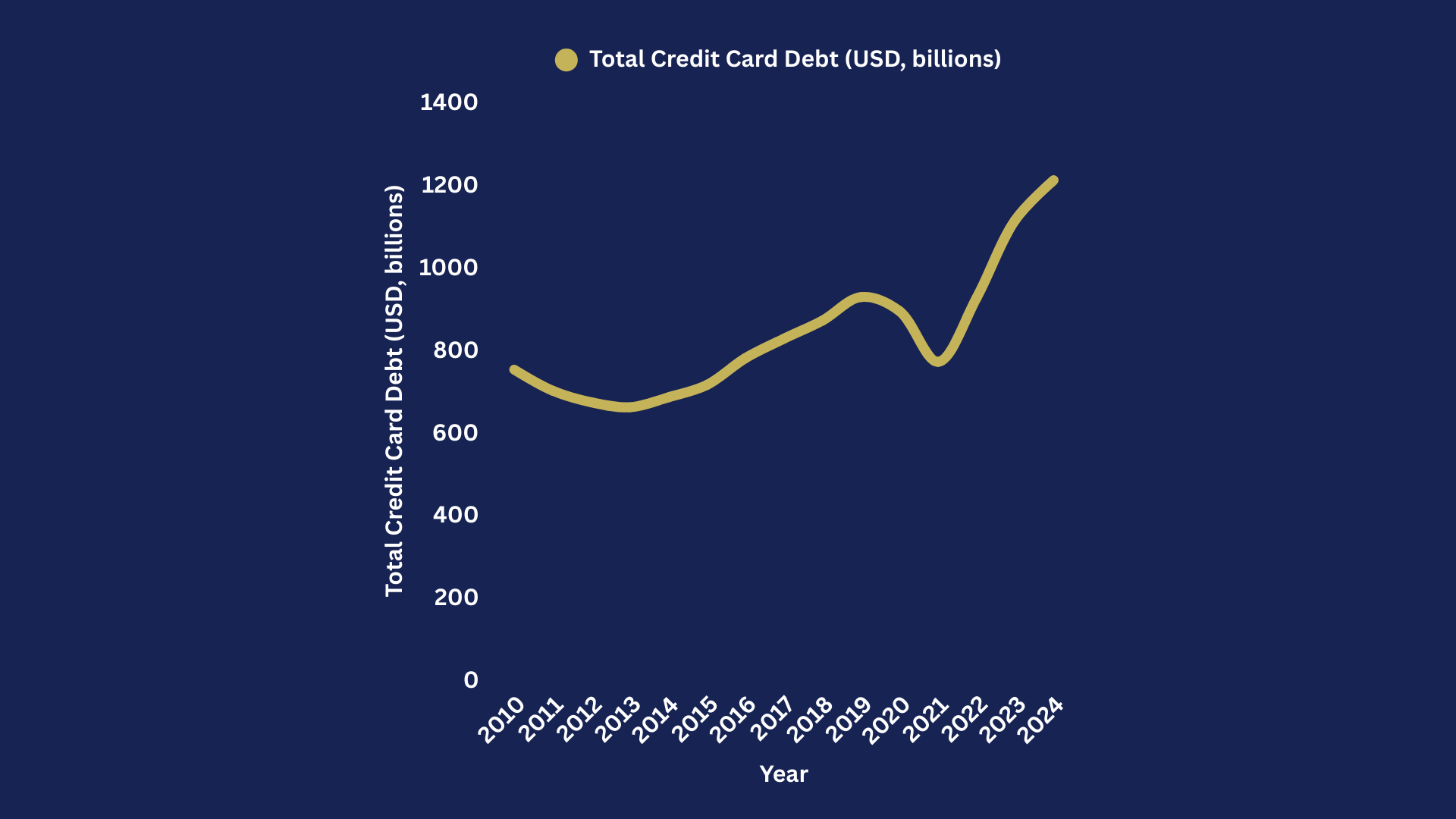 To see just how dramatically balances have climbed since 2020, take a look at the 15-year trend shown here which illustrates the steady rise of credit card debt in the United States year after year.